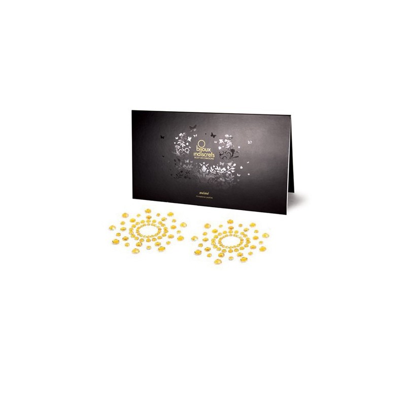Pieza de lencería erótica consistente en un adorno corporal para decorar pezones. Puestos resultan especialmente sexys y provocadoras resaltando de forma extraordinaria la belleza de los senos. Cubre pezones autoadhesivos de brillantes de Bijoux Indiscrets.